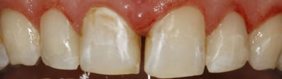 BEFORE : This young lady has mottled enamel that causes otherwise healthy teeth to look unattractive. With some patients, particularly younger ones, directly applied composite veneers may be a more appropriate treatment alternative than porcelain veneers.