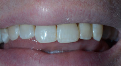 After crowns on all of the lower teeth have been placed, this patient has much more attractive lower teeth and a functional occlusion.
